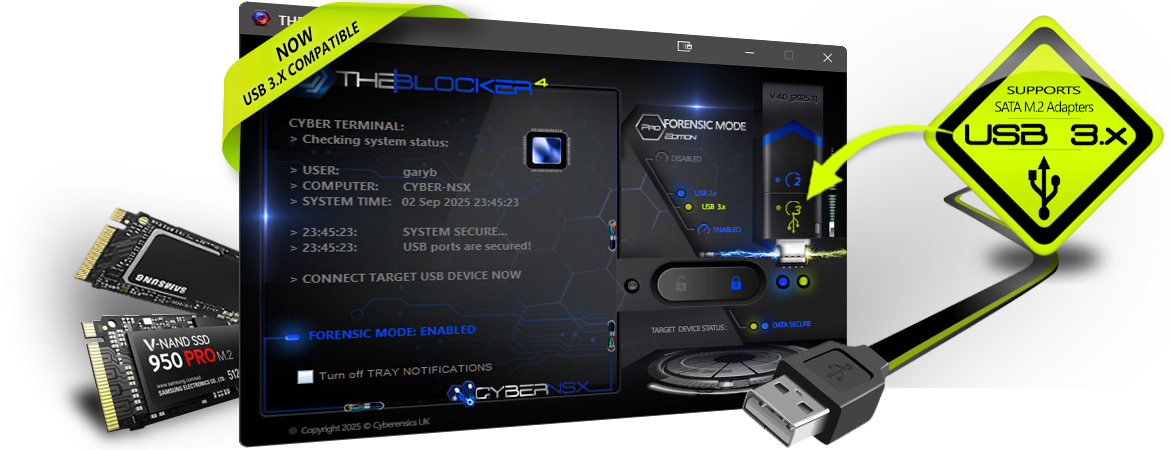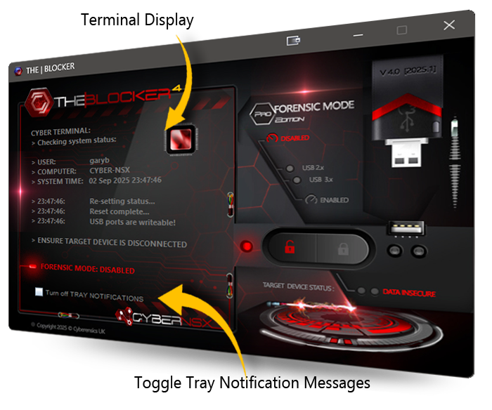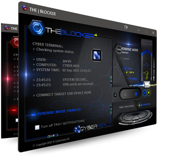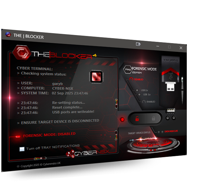 This release has introduced an attractive and functional new look... When 'Forensic Mode' is enabled... the interface turns blue in colour, leaving you in no doubt the intergrity of any subsequently connected USB devices and that they are protected from any attempts to write data back to the device. When disabled, an red warning interface clearly shows you the 'Forensic Mode' has been disabled and that USB devices can now be written to. This application also takes advantage of additional Windows 10 & 11 features, including the 'notification' feature, displaying a message on-screen each time the 'Forensic Mode' is changed, keeping the user in no doubt as to the status of the system and protecting the integrity of any target USB devices.
